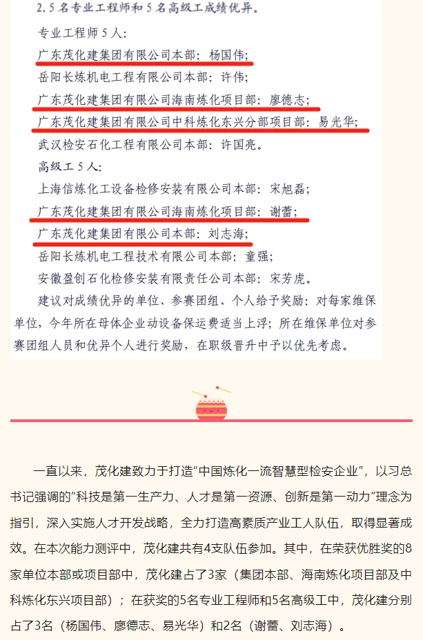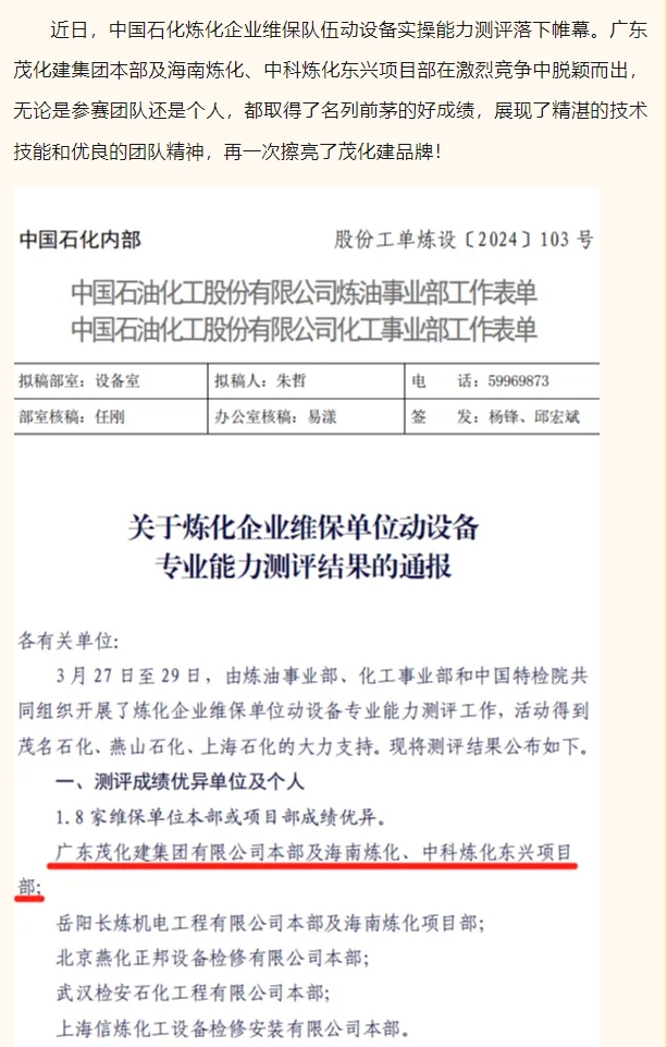 祝賀!茂化建在中石化煉化企業維保隊伍動設備🤑實操能力測評中成績優異,名列前茅